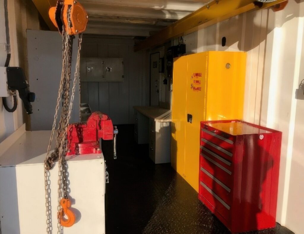 All electrical components of our standard Workshop Modules are rated for Zone I operation. Our standard Workshops are supplied with a steel workbench complete with a vice, as well as specially designed storage rack and tool hanger to provide an efficient, well-organized and secure tool storage system. We can also outfit these modules to best suit your project’s specific requirements.